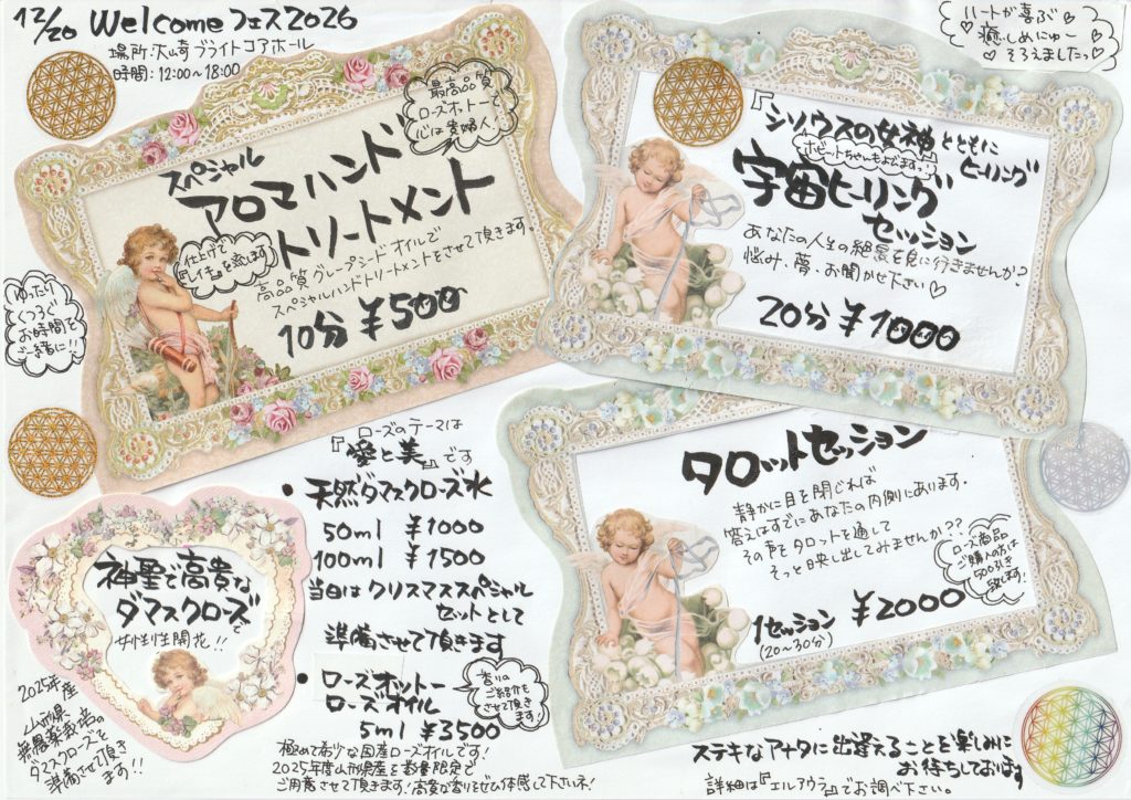 国産有機ローズ商品の販売、3つのヒーリングメニューをフェス限定価格でご提供します。
