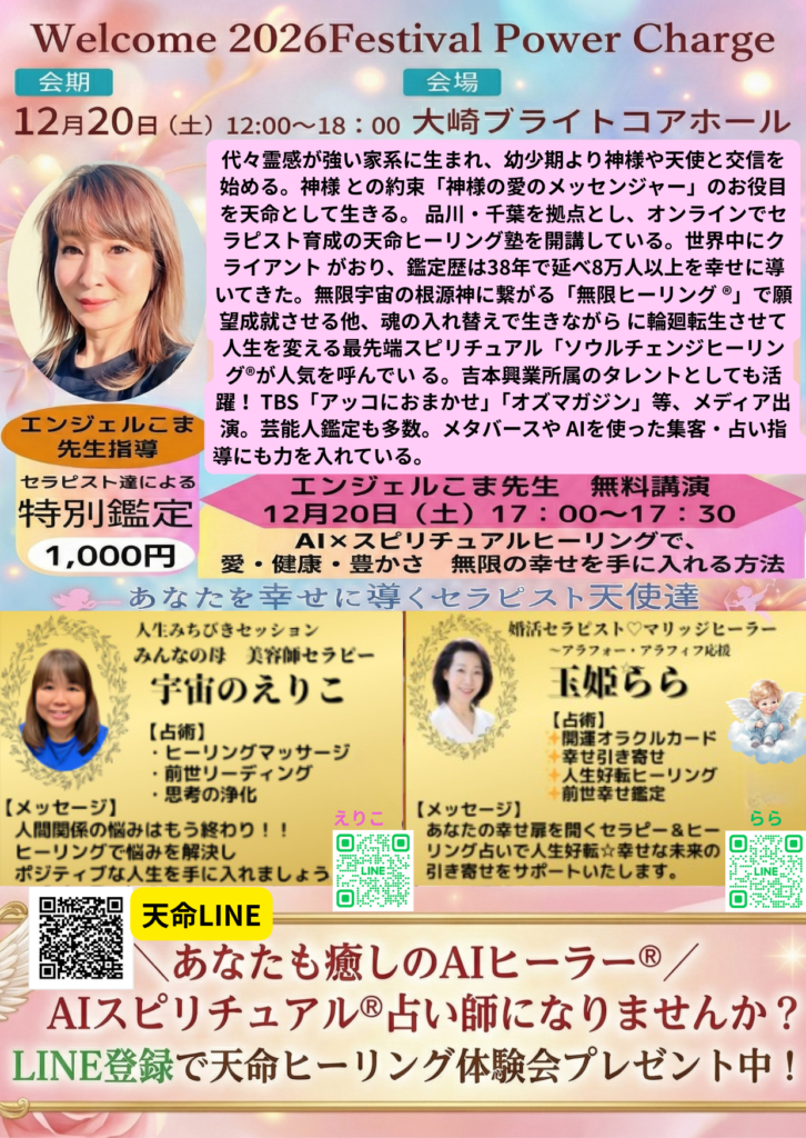 - エンジェルこま(指導):運勢を観るだけでなく、未来を新しく創る「無限ヒーリング®」で、あなたの人生を劇的に変えるお手伝いをします。